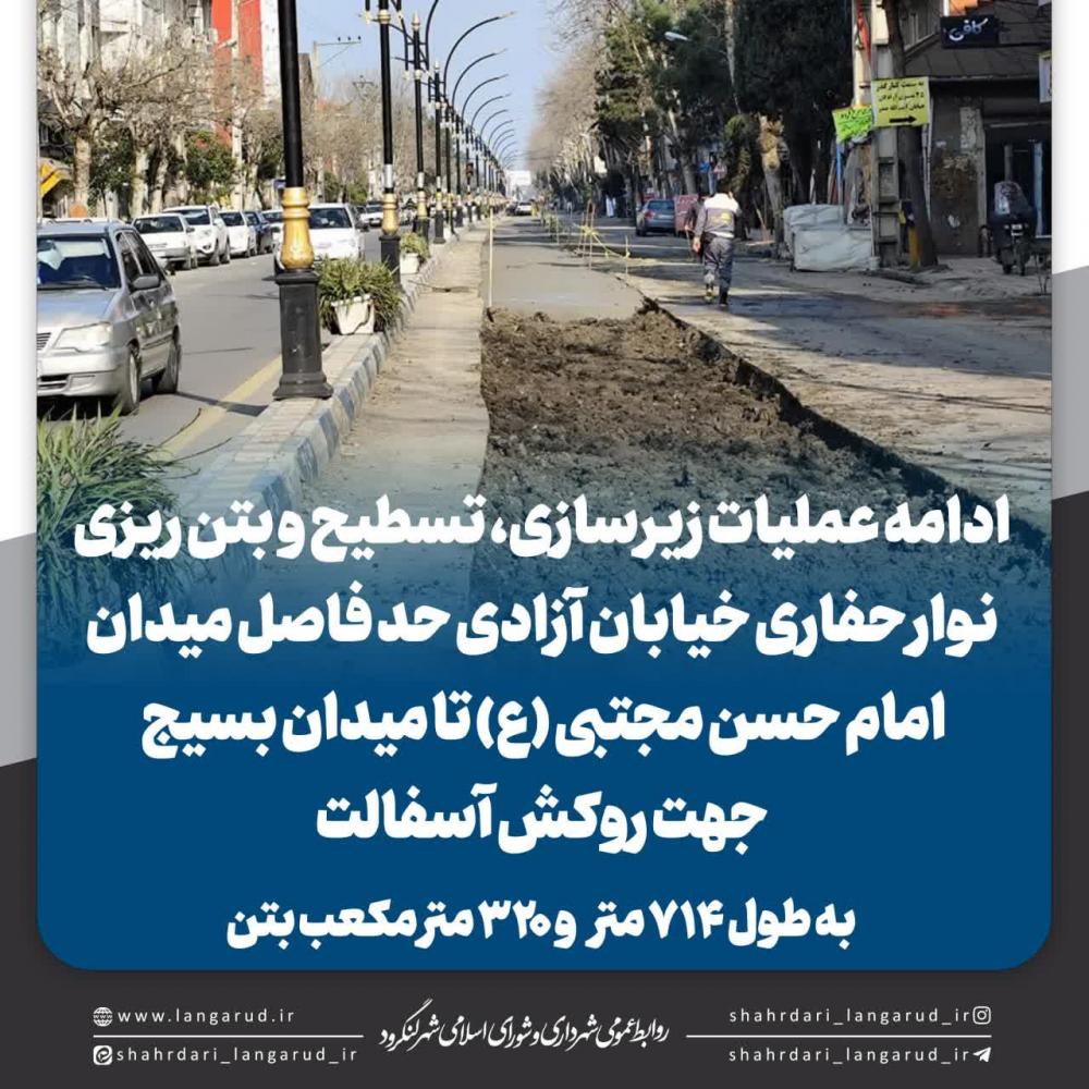 شهرداری لنگرود | ادامه عملیات زیرسازی، تسطیح و بتن ریزی نوار حفاری خیابان آزادی حد فاصل میدان امام حسن مجتبی (ع) تا میدان بسیج جهت روکش آسفالت به طول ۷۱۴ متر و ۳۲۰ متر مکعب بتن